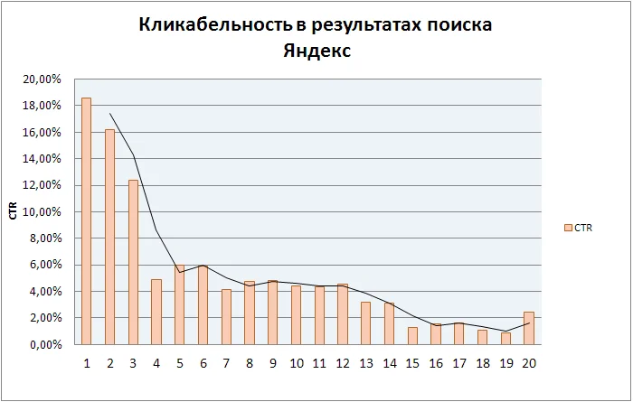 Как видно на таблице и графике, ситуация очень схожа с той, что можно увидеть в ПС Google. Разве что с кликабельностью за пределами топ-3 в Яндекс дела обстоят ещё хуже.