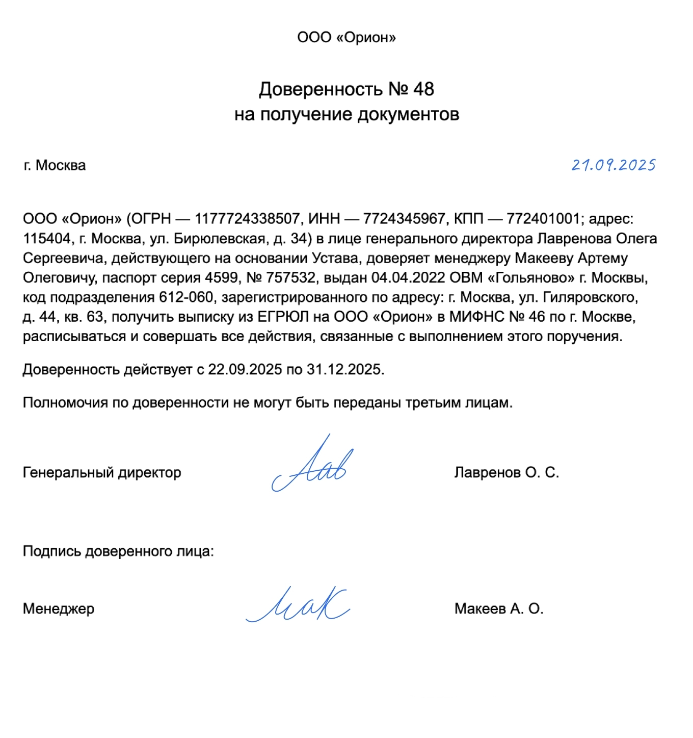Пример: Анна работает бухгалтером и не может лично забрать выписку из банка для своей компании. Она оформляет доверенность на своего коллегу, Ивана, в которой указывает, что Иван имеет право получить выписку по счету ООО «Ромашка» за период с 1 апреля 2025 года по 31 мая 2025 года. Анна заверяет доверенность у нотариуса, Иван идет в банк с доверенностью и своим паспортом и успешно получает необходимую выписку.