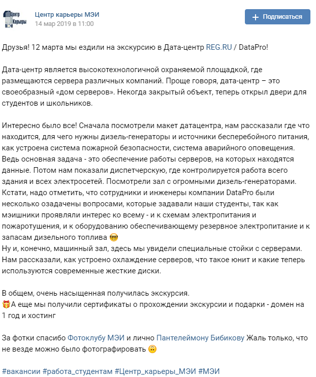 «Экскурсии в дата-центр — отличная возможность для молодых людей посмотреть, как устроена интернет-инфраструктура и получить уникальный опыт, который, возможно, станет первым шагом в профессию. Клиенты REG.RU, в свою очередь, получают живое подтверждение заботы о защищённости и работоспособности их сайтов. А ценность для нас — лояльные и активные пользователи, которые становятся нашими амбассадорами.