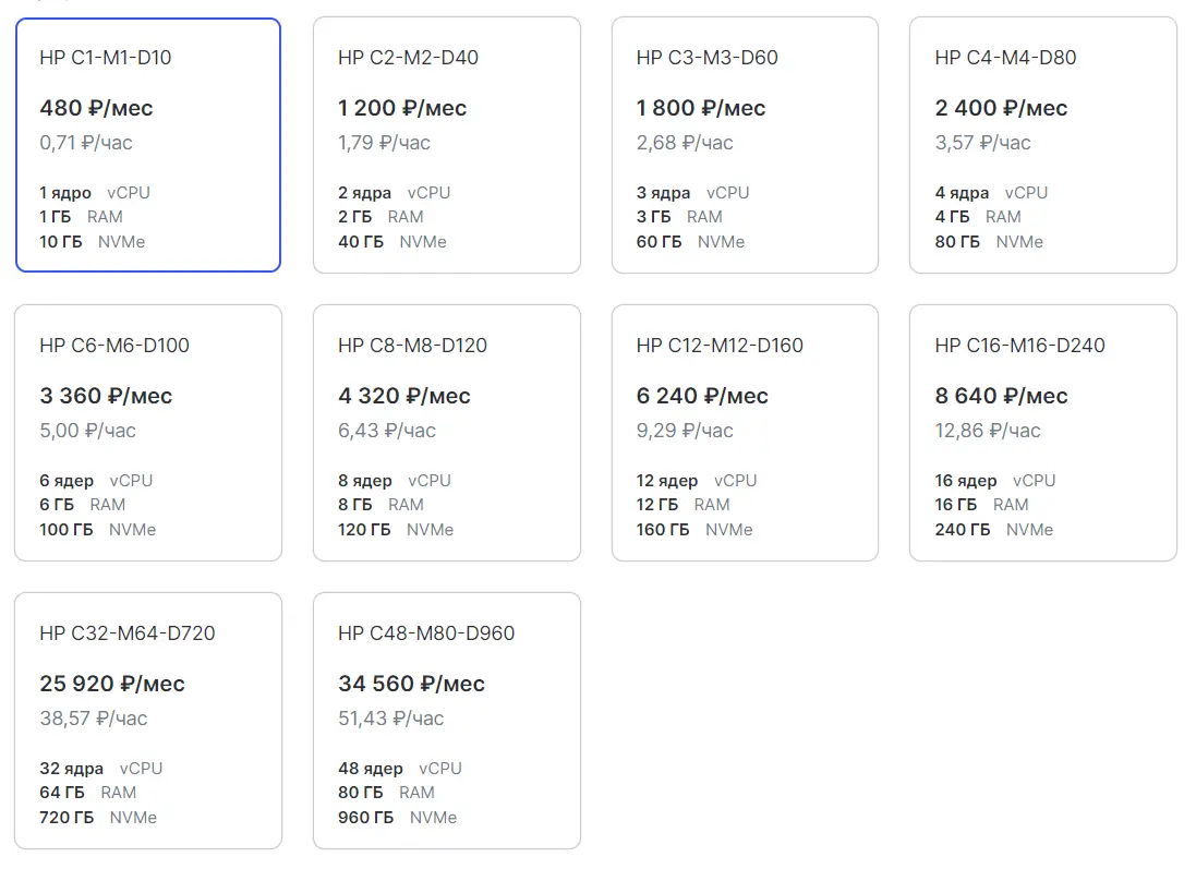 Рег.ру предлагает высокочастотные тарифы облачных серверов с NVME дисками для для настройки игрового сервера, цены начинаются от 1,44 рублей в час.