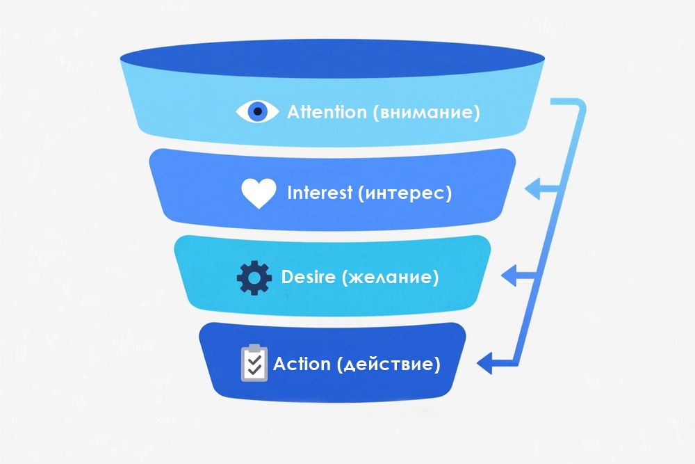 Модель AIDA (Attention → Interest → Desire → Action) предполагает последовательное движение клиента по этапам без возвратов.